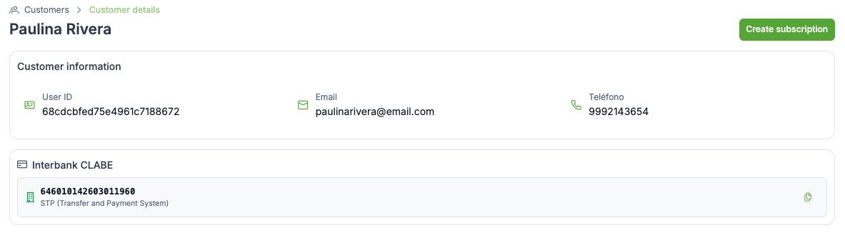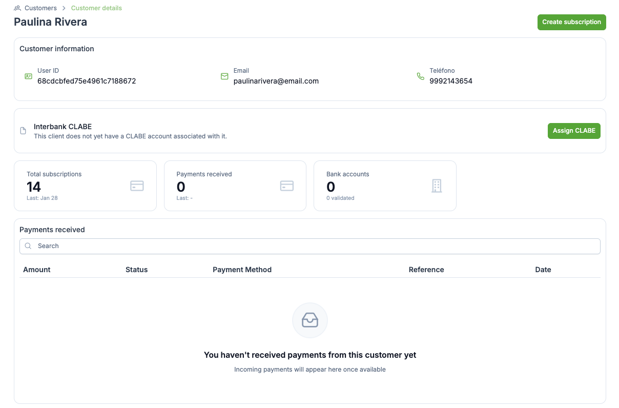 Customers can use the assigned CLABE to make payments to a merchant. This payments will appear in the Payments received section in the Customer details.