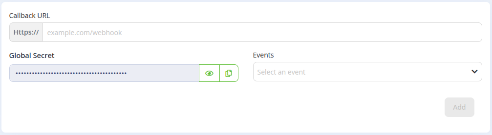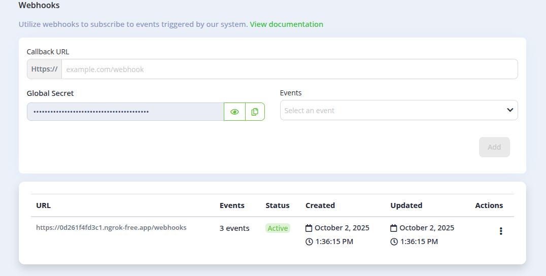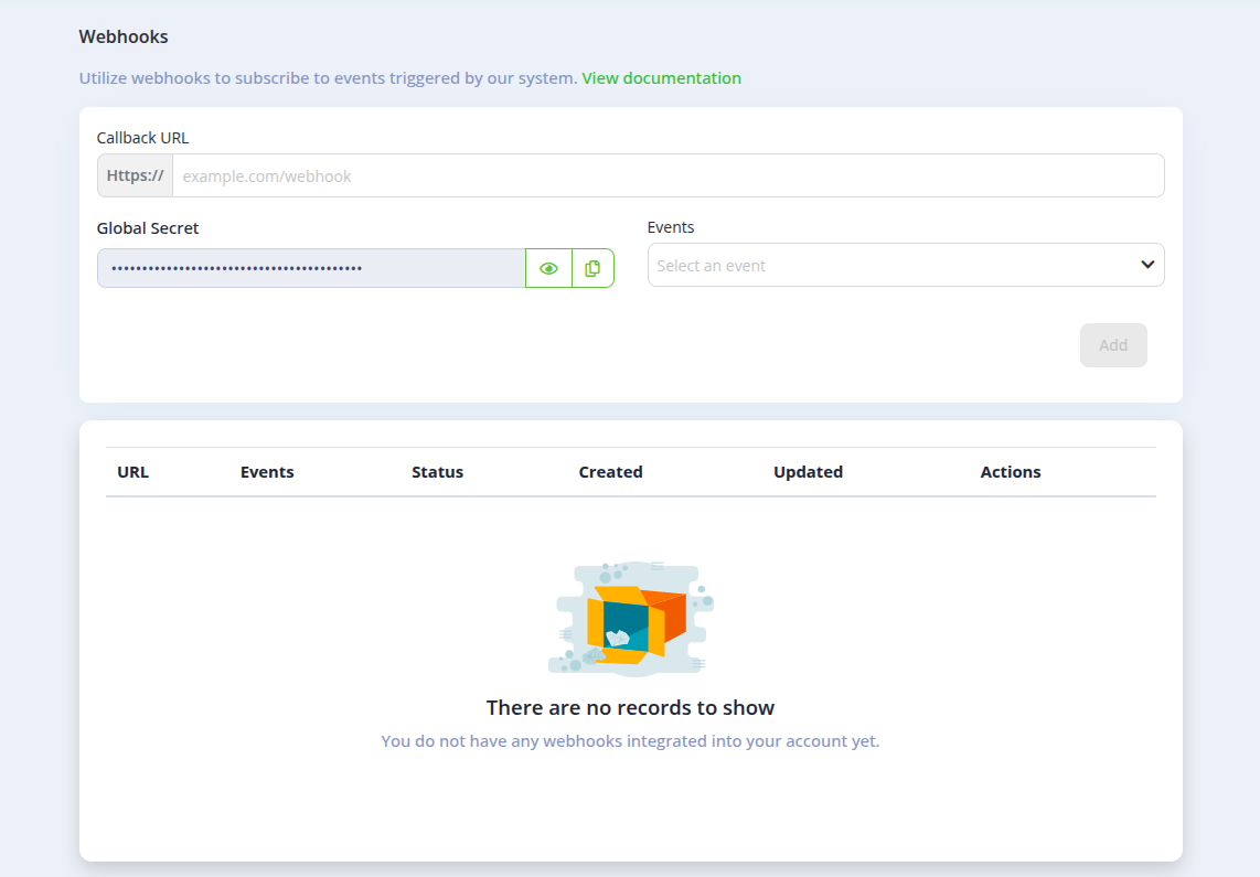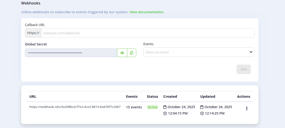 Where you can easily create, edit, deactivate, or delete your webhooks from the interface. This interface will allow you to setup a Callback URL, see the available events to configure with Webhooks, view your Global Secret key, and the list of Webhooks already configured.