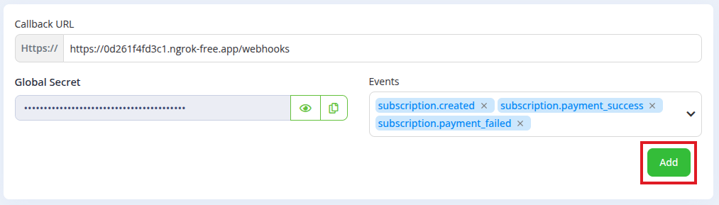 Copy your Global Secret, which will be used to verify the authenticity of incoming notifications.